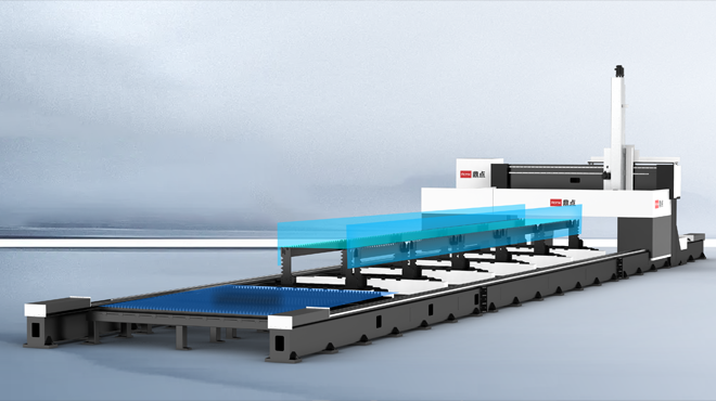 型材支撐機構,可氣動對齊,自動化程度高,模塊化設計,可自由調配。床身為地軌式結構,分段拼接,便于大幅面設計與運輸,和工作臺分體設計,減少設備損害。